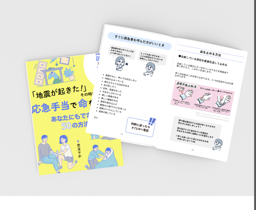家庭でできる応急手当をまとめた小冊子。地震や災害時に命を守る50の方法を紹介。児玉りかが宮崎から発信。